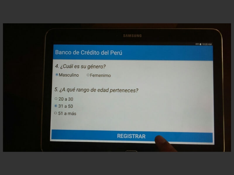 Diseño y desarrollo de una encuesta para tabletas Android de 14 pulgadas, la encuesta estaba conformada por cuatro (4) preguntas simples con múltiples opciones de respuestas, el trabajo fue realizado en la Iglesia Las Nazarenas ubicada en el centro de Lima, se agregó el servicio de alquiler de cinco tabletas Samsung de 14 pulgadas.