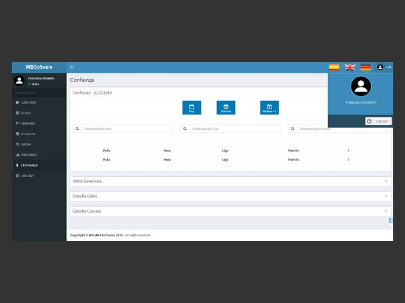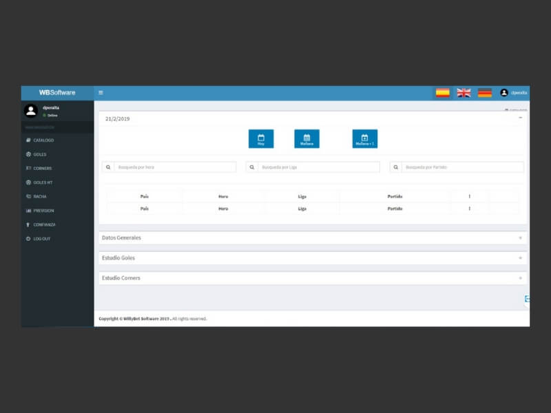 Diseño y Desarrollo web de la vista del sistema WillyBet Software - España, se acordó con el cliente realizar un diseño web personalizado y adaptable para todos los dispositivos móviles, el trabajo realizado se enfocó en realizar peticiones externas a un Web Service otorgado por el cliente para mostrar los datos de los análisis en el diseño realizado.