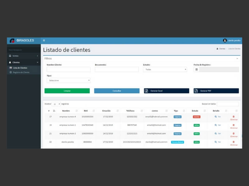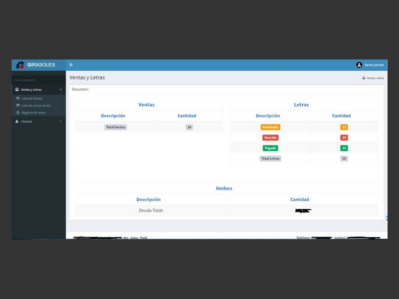 Implementación de un sistema integrado de clientes, ventas y letras de pago; cumple las funciones de registro de clientes, venta de productos, generación y seguimiento de letras de pago con cálculo de moras según las normas vigentes del cliente. El sistema permite el descargo automático de reportes gerenciales y tablas de información en formato Excel.